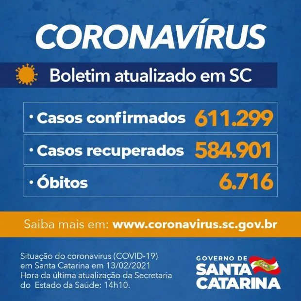 Santa Catarina tem 611.299 pacientes com confirmação de infecção pelo novo coronavírus, dos quais 584.901 estão recuperados e 19.682 permanecem em acompanhamento. O balanço foi divulgado neste sábado, 13. Desde o início da pandemia, 6.716 óbitos foram causados pela doença respiratória. A taxa de letalidade é de 1,1%.