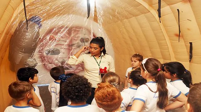 No lado de dentro, ela simula em tamanhos grandes todas as partes do ouvido. A estrutura pertence ao Sesi e foi alugada pela Secretaria de Saúde de Guabiruba. As turmas assistem as explicações de para entender como funciona a audição e como fazer a limpeza correta do ouvido.