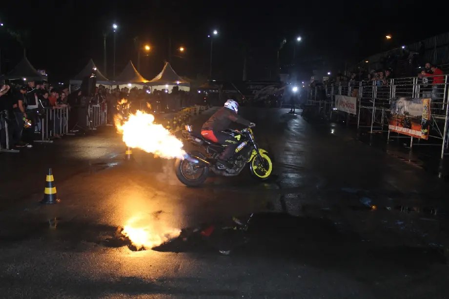 Mas a adrenalina da noite não ficou apenas no som do melhor do rock roll. As manobras radicais no solo do show de Wheeling deixaram muita gente sem ar. Das pilotagens sobre uma única roda, acrobacias com mais de um piloto sobre a mesma motocicleta até rodas e pneus motos em chamas, a emoção rolou à solta.
