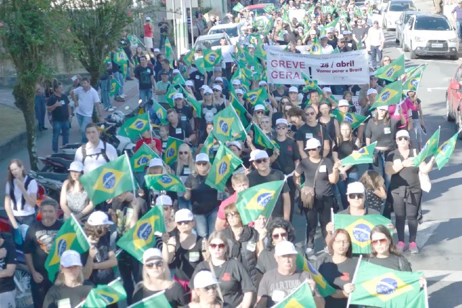 Entre 300 e 500 pessoas participaram da passeata contra as reformas trabalhista e da Previdência na cidade de Brusque nesta sexta-feira (28). Vestidos de preto, os manifestantes percorreram ruas no Centro da cidade empunhando bandeiras do Brasil.