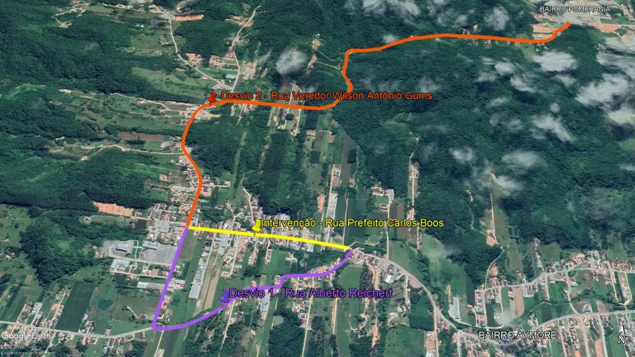 A partir da próxima semana, conforme as condições climáticas, as obras da principal via do bairro Aymoré devem iniciar. A previsão de início dos trabalhos de drenagem é já na segunda-feira, se não houver chuva. Por conta disso, um trecho de aproximadamente 780 metros (entre os mercados Köhler e Moreira) estará em meia pista. Os motoristas que transitarem pelo bairro devem ficar atentos e utilizar as ruas Alberto Reichert e Vereador Wilson Antônio Gums como alternativa (conforme a imagem do mapa).