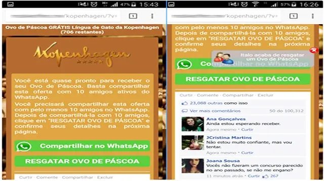 Mais de 300 mil brasileiros tentaram acessar nas últimas 24 horas um golpe no WhatsApp que oferece ovos de Páscoa gratuitos. A contagem foi divulgada na tarde de quinta-feira (6) pela empresa de segurança PSafe, que alerta para os riscos que os internautas correm ao abrir os links que prometem brindes da rede de lojas Kopenhagen.