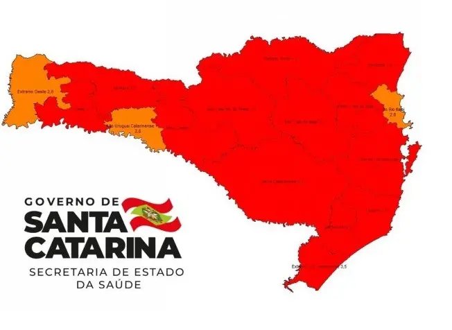 O Governo de Santa Catarina e a Secretaria de Estado da Saúde divulgaram na quarta-feira (25), os dados da Matriz de Risco Potencial. Das 16 regiões de saúde avaliadas, apenas três delas, Extremo-Oeste, Alto Uruguai Catarinense e Foz do Rio Itajaí, não ficaram no Risco Gravíssimo – todas as outras 13 foram classificadas na cor vermelha, que é o mais alto nível de Risco, enquanto as três regiões ficaram na cor laranja, que é o risco grave.