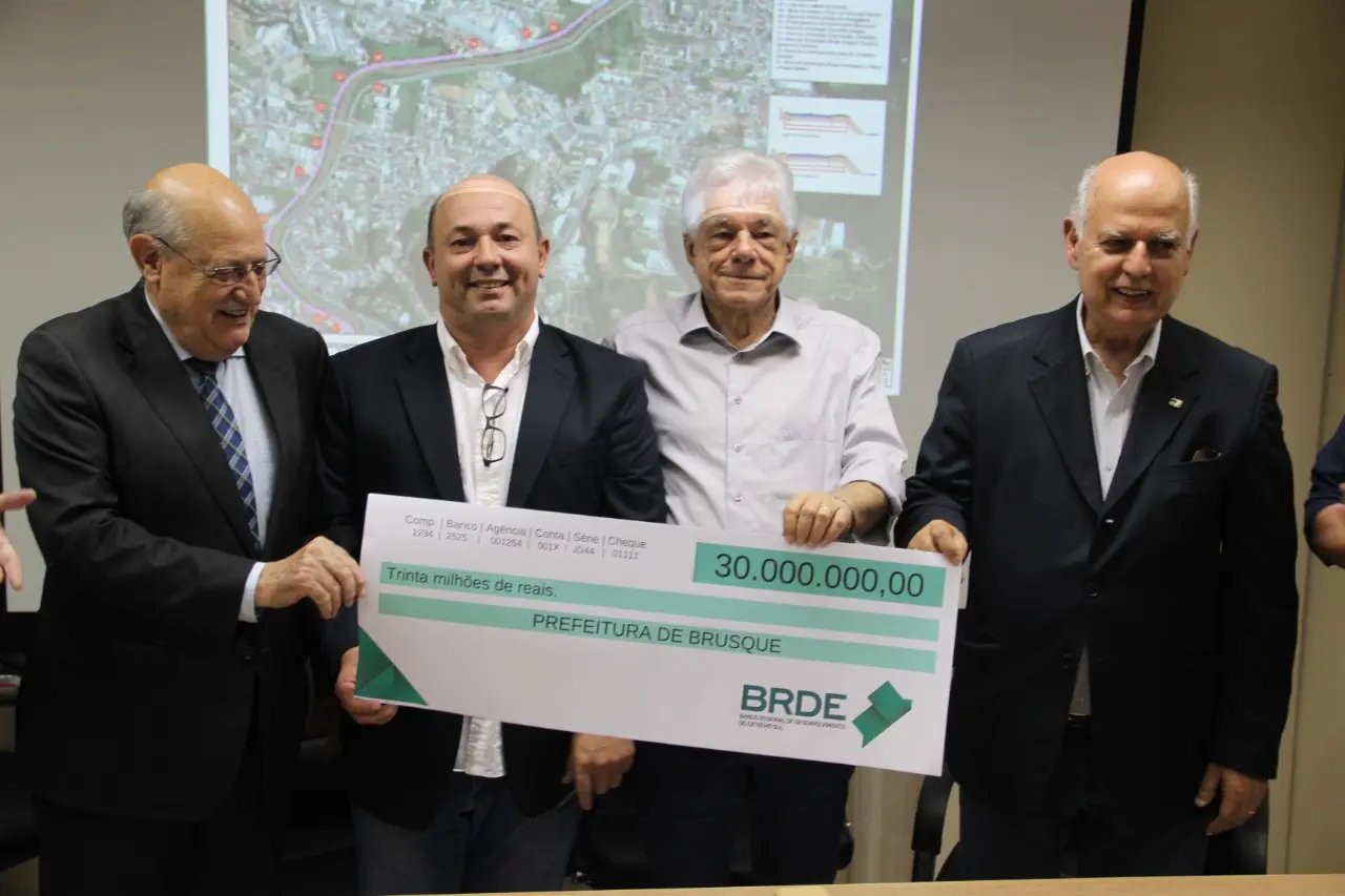 Uma cerimônia no salão nobre da Prefeitura de Brusque, na tarde desta quarta-feira (19), marcou a assinatura do contrato entre a Prefeitura de Brusque e o BRDE (Banco Regional de Desenvolvimento do Extremo Sul) no valor de R$ 30 milhões que serão destinados às obras do prolongamento da Beira Rio, na margem esquerda e na elaboração de um Plano de Mobilidade Urbana para Brusque.