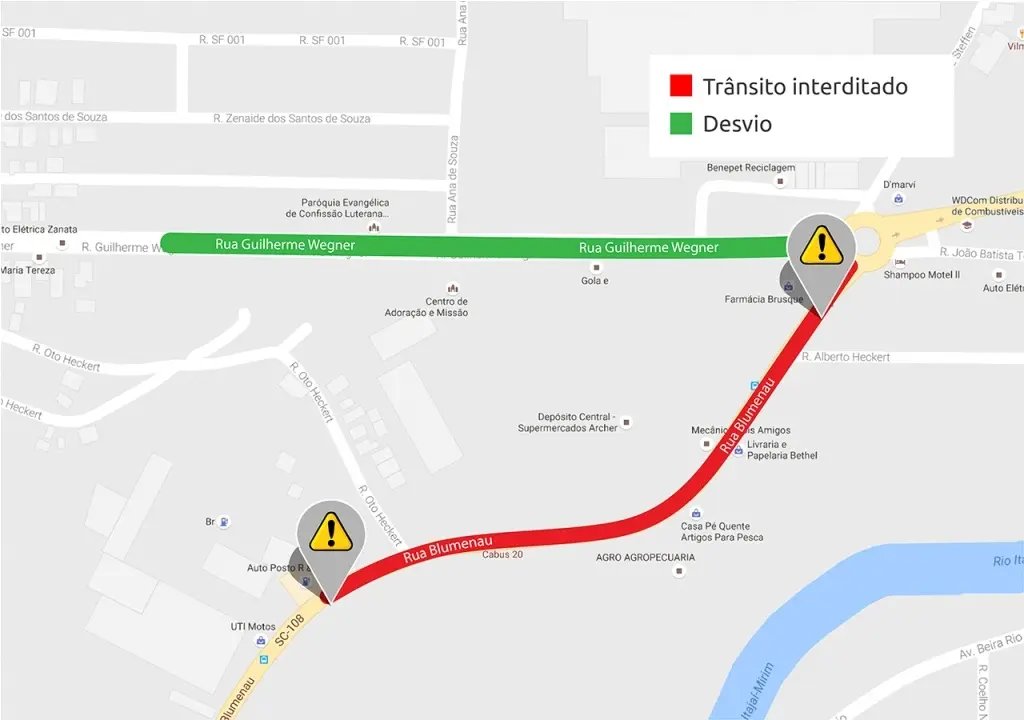 Durante os serviços, os motoristas vindos do bairro Steffen ou da Rodovia Ivo Silveira deverão utilizar a rua Guilherme Wegner, como desvio alternativo para o Centro. Já os moradores das imediações terão o acesso local liberado. As intervenções previstas para serem concluídas até as 12h estão condicionadas à estabilidade do clima.