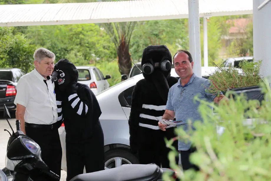 Para motivar os servidores públicos a colaborar com a fiscalização de aproximadamente dez minutos composta por cumprir um check-list de locais de risco para proliferação do mosquito, profissionais da Secretaria de Saúde vestiram-se de aedes aegypti e acompanharam a verificação.