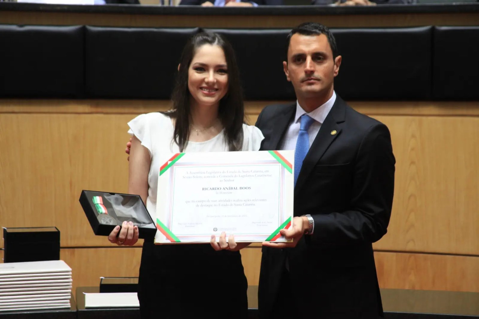 Outro que esteve na sessão em Florianópolis foi o vereador Cristiano Kormann, que lembrou dos feitos de Ricardo e da amizade com o ex-presidente do partido. A homenagem foi proposta pelo deputado estadual João Amin, através de indicações da comitiva guabirubense. Representando o marido, a esposa Ana Cristina Schaefer Boos recebeu a placa de homenagem no plenário.