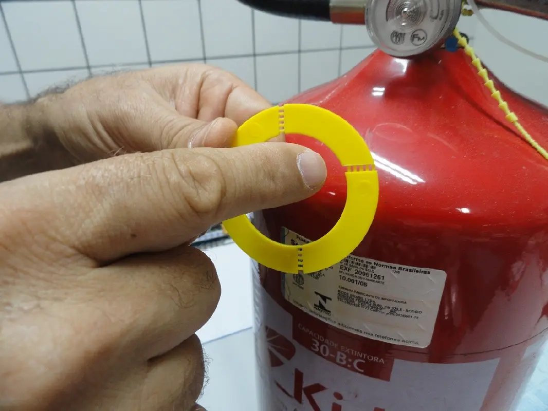 ANEL DO CILINDRO: todos os anos o Inmetro padroniza uma cor específica para este componente, que é utilizado em extintores que passaram por recarga (extintores novos não possuem anel de cilindro). Em 2012 era amarelo, 2013 verde, 2014 branco, 2015 azul, 2016 preto, 2017 alaranjado e 2018 púrpura.
