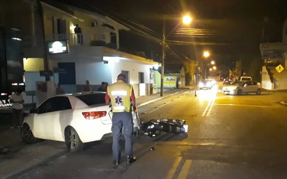 Por volta das 22h45 desta quarta-feira (3) ocorreu um acidente envolvendo carro e motocicleta, na avenida Primeiro de Maio, bairro do mesmo nome. Uma guarnição da Polícia Militar passava pelo local e imediatamente acionou o Corpo de Bombeiros para socorrer o piloto que estava ferido.