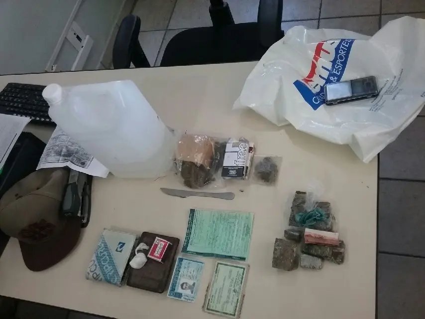 Após a busca veicular, os policiais encontraram cerca quantia de substância semelhante à maconha, cocaína, 2,5 litros de lança perfume, uma balança de precisão digital, dois celulares e R$ 30 em espécie.