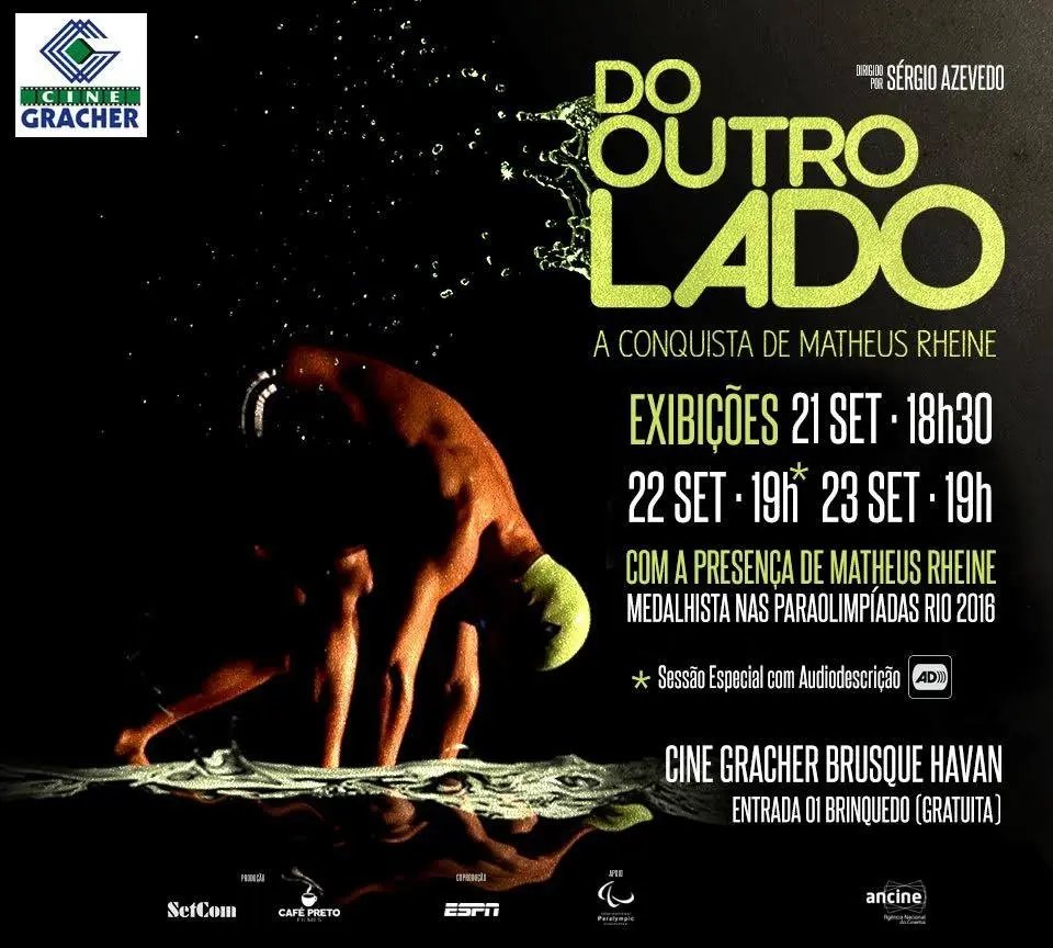 Entre quarta e sexta-feira (21 a 23), o Cine Gracher Havan irá reprisar o documentário do nadador brusquense e medalhista paralímpico, Matheus Rheine, intitulado “Do outro lado – a conquista de Matheus Rheine”. As sessões ocorrem às 18h30min, às 19 e às 19h, respectivamente, com a presença do paratleta.