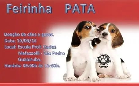 No próximo sábado (10), a ONG PATA (Protegendo os Animais com Todo o Amor), de Guabiruba, promove mais uma feira de adoção de cães e gatos. O evento está marcado para começa as 9h com termino previsto para 12h nas dependências da Escola Carlos Maffezzolli no bairro São Pedro em Guabiruba.