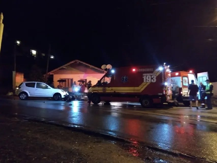 A pista molhada e a curva fechada na rua Gustavo Halfpap, bairro Primeiro de Maio, fez novas vítimas na noite desta segunda-feira (03). Por volta das 20h30 um veículo Ford Ka de de cor branca descia na direção centro ao bairro e o motorista perdeu o controle da direção, atingindo uma motocicleta Honda 125, de cor dourada, que iniciava a subida da via no sentido contrário.