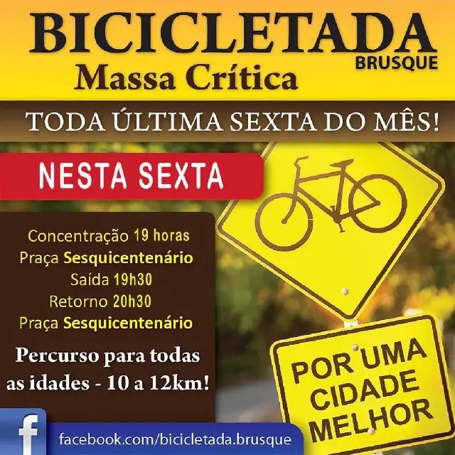 Como acontece em toda última sexta-feira de cada mês, neste dia 26, Brusque terá mais uma edição da Bicicletada. A concentração para mais um pedal acontece a partir das 19h, na Praça Sesquicentenário, no centro. A saída está marcada para 19h30, e o retorno é programado para as 20h30, no local de partida.