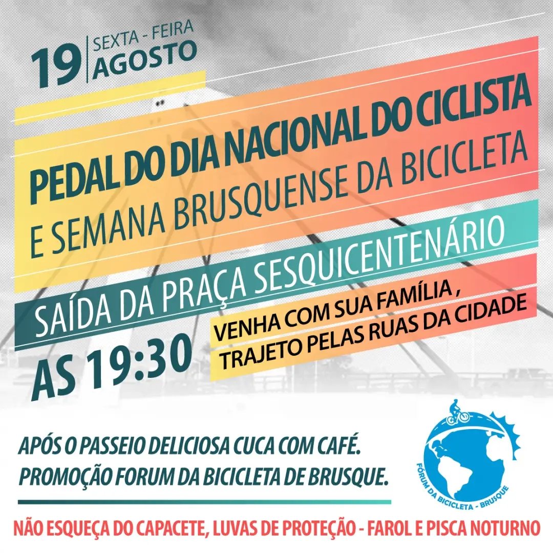 Nesta sexta-feira (19), o Fórum da Bicicleta de Brusque realiza mais uma edição de suas tradicionais pedaladas. Porém, desta vez, a comemoração é pelo Dia Nacional do Ciclista, além da Semana Brusquense da Bicicleta. O evento está programado para iniciar às 19h, com saída da Praça Sesquicentenário, no Centro.