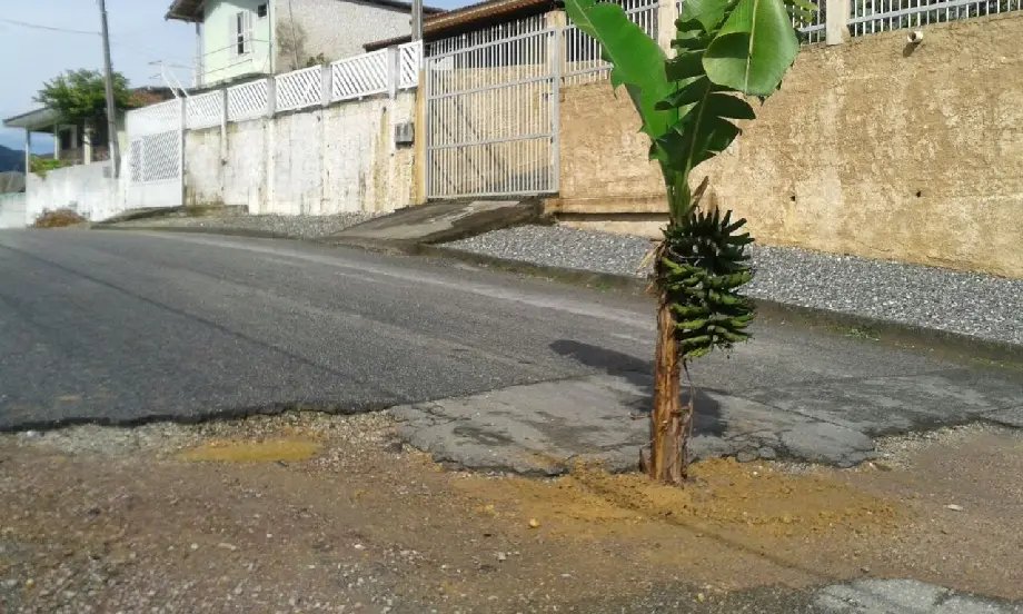 Para chamar atenção do poder público, moradores da rua Eugênio Brandt no bairro Limeira, plantaram uma bananeira no meio da rua nessa segunda-feira (15). Segundo os moradores a falta de manutenção na via está causando verdadeiras crateras.