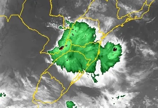 Um sistema de baixa pressão está sobre a região sul do Brasil, e aliado com uma frente fria em deslocamento pelo oceano, próxima ao litoral catarinense provocam as condições instáveis, favorecendo a chuva e até mesmo a ocorrência de raios em qualquer momento do dia em toda a região.