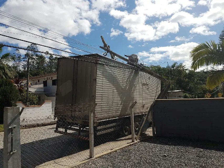 Um caminhão bateu contra um poste, na Rua José Dirschnabel, no Centro de Guabiruba, por volta das 11h59min.