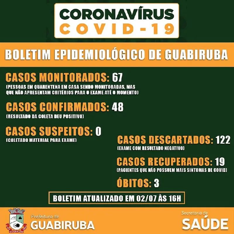 A cidade de Guabiruba informou esta tarde que registrou mais sete casos de Covid-19 e soma, agora, 48 desde o começo da pandemia. Os novos casos positivos são cinco mulheres de 19, 42, 43, 48 e 61 anos, além de um homem de 65 anos, todos em isolamento e tratamento domiciliares, e outro homem de 44, que está internado em enfermaria.