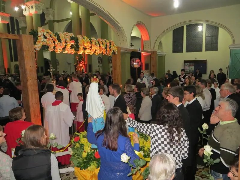 Aproximadamente uma hora depois a carreata chegou ao Santuário de Azambuja, no bairro de mesmo nome, onde, na igreja, houve uma celebração regada de fé, alegria e a boa música proporcionada pelo coral que abrilhantou a missa. Houve a presença dos festeiros que estiveram em lugar de destaque no altar.