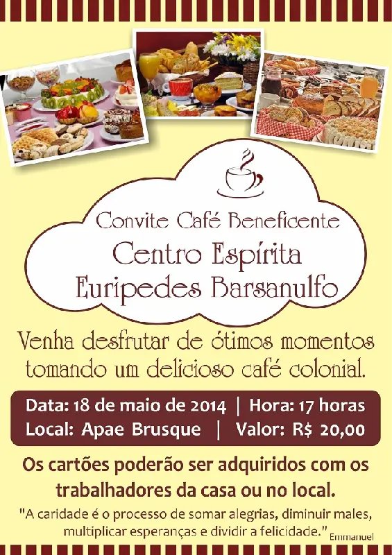 No próximo domingo (18) acontece o café colonial beneficente realizado pelo Centro Espírita Eurípedes Barsanulfo. O evento será na sede da Associação de Pais e Amigos dos Excepcionais de Brusque (Apae), a partir das 17h.