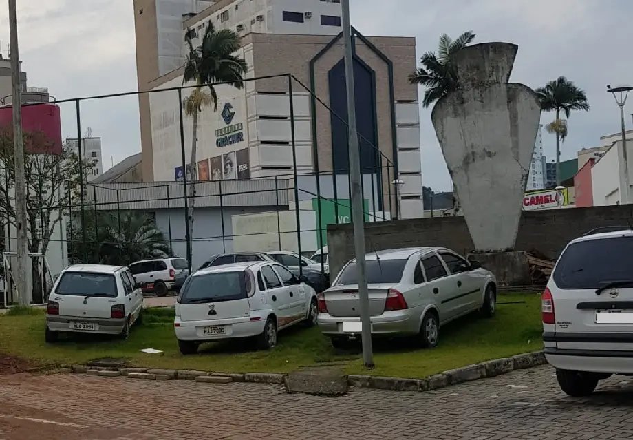 Dos veículos que ali estão estacionados em locais que não deveriam permanecer ao menos três deles são da frota municipal.