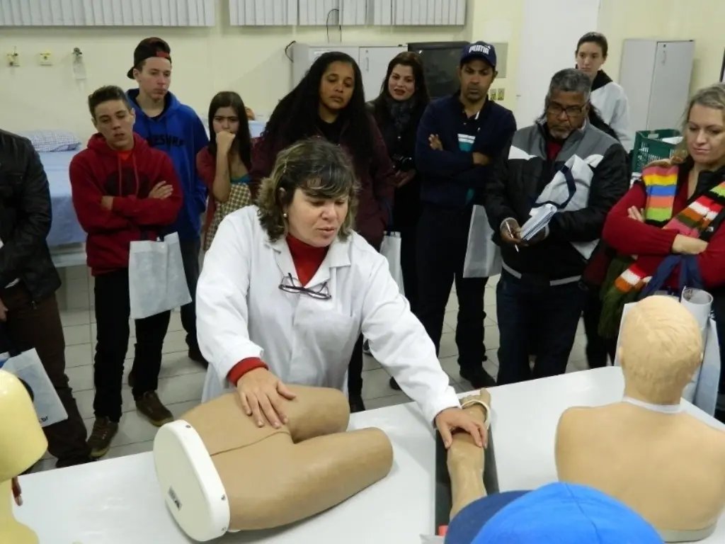 Ao longo da noite, os alunos puderam aprender no Laboratório de Enfermagem a abordagem inicial, os procedimentos imediatos a um paciente, bem como quais materiais são usados para a formação dos acadêmicos.