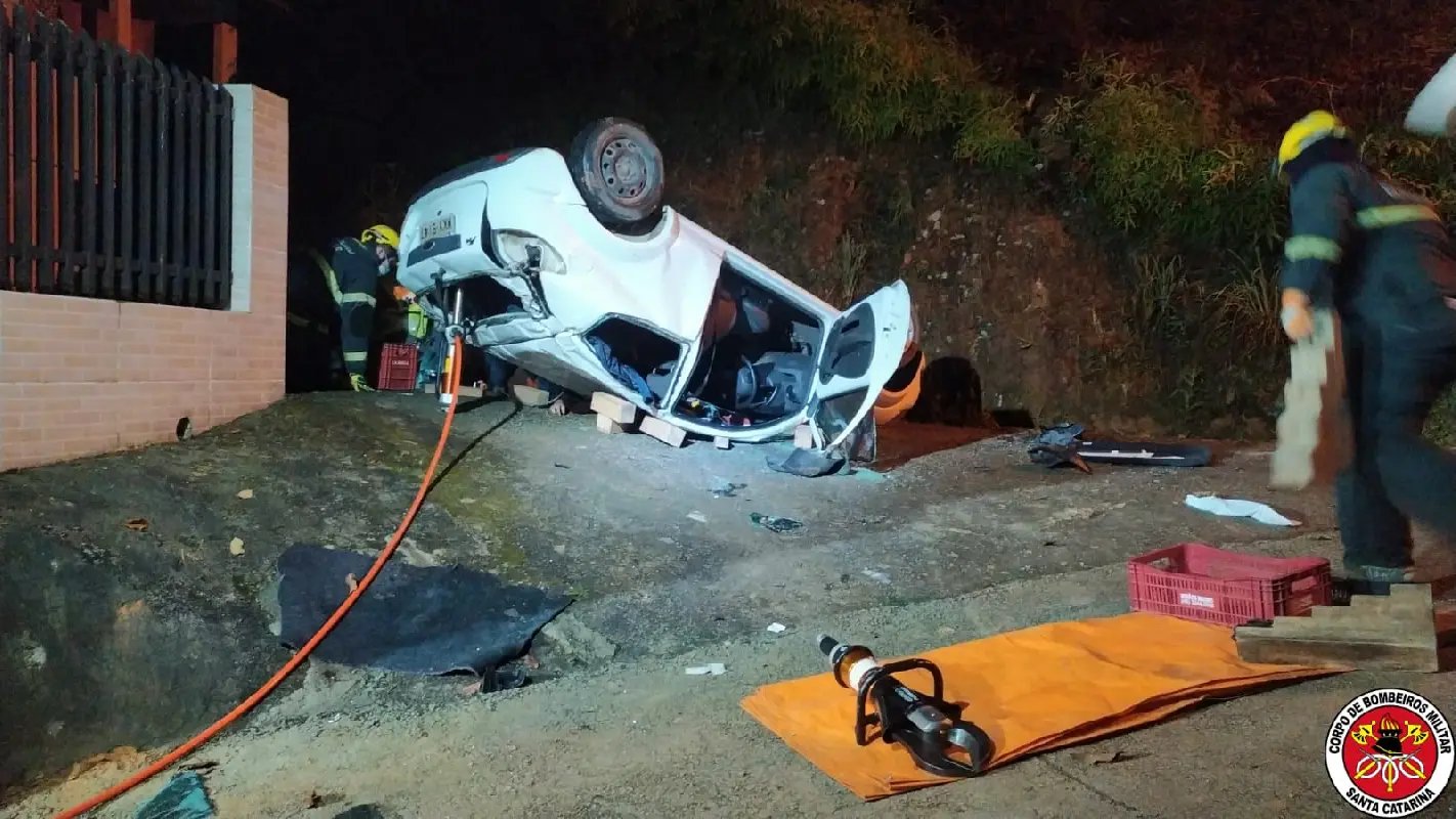 Na madrugada deste domingo (07), por volta da 1h05, um carro Ford Ka, com placa de Brusque, capotou no bairro do Batêas. Uma mulher que estava no banco da frente morreu no local, já o condutor do veículo conseguiu sair do carro consciente.
