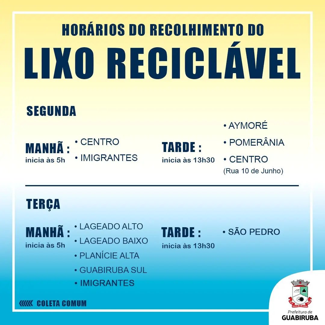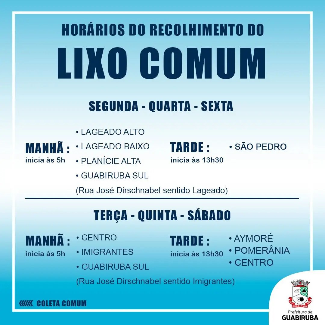 Na tarde desta quinta-feira (29), a Prefeitura de Guabiruba divulgou os dias e horários em que é feito o recolhimento de lixo na cidade. A divulgação foi feita após alguns moradores entrarem em contato durante esta semana para obter informações sobre o horário de recolhimento do lixo.