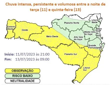 A Defesa Civil de Santa Catarina emitiu um Aviso Meteorológico para essa condição meteorológica. O objetivo do Aviso é preparar os municípios e a população de cada região sobre o que está previsto no modelo meteorológico para que, caso necessário, consigam tomar medidas preventivas.