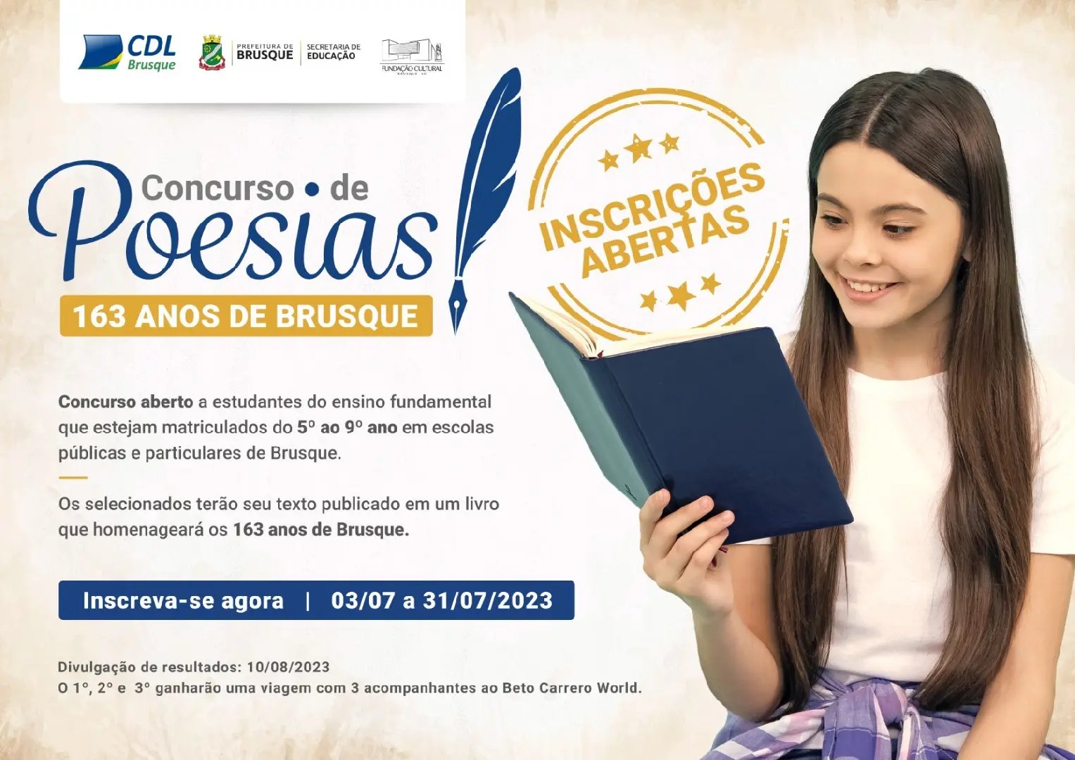 Câmara de Dirigentes Lojistas de Brusque (CDL Brusque), em parceria com a Fundação Cultural e Secretaria de Educação do Município, lançou o 1º Concurso de Poesias da CDL de Brusque, alusivo aos 163 anos da cidade. O projeto tem como objetivo selecionar poesias originais e inéditas com o tema “Minha Cidade”, visando homenagear o aniversário de fundação do município. Podem participar do concurso alunos matriculados nas escolas de ensino fundamental de Brusque, particulares ou públicas, do 5º ao 9º ano, com poesias inéditas. As inscrições vão até o dia 31 de julho, nas secretarias das escolas.