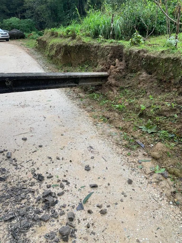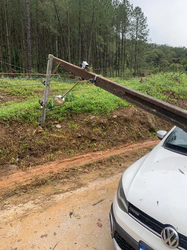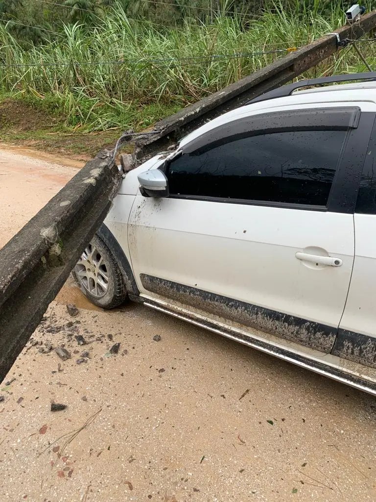 Na manhã desta sexta-feira (11), o motorista de uma VW/Saveiro levou um susto após o seu carro ser atingido por um poste que caiu quando uma barreira cedeu no bairro Lageado Baixo, em Guabiruba.