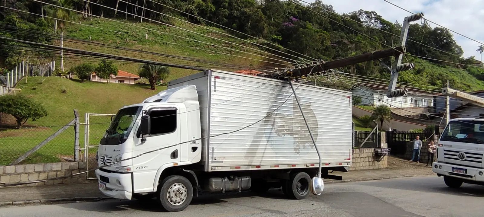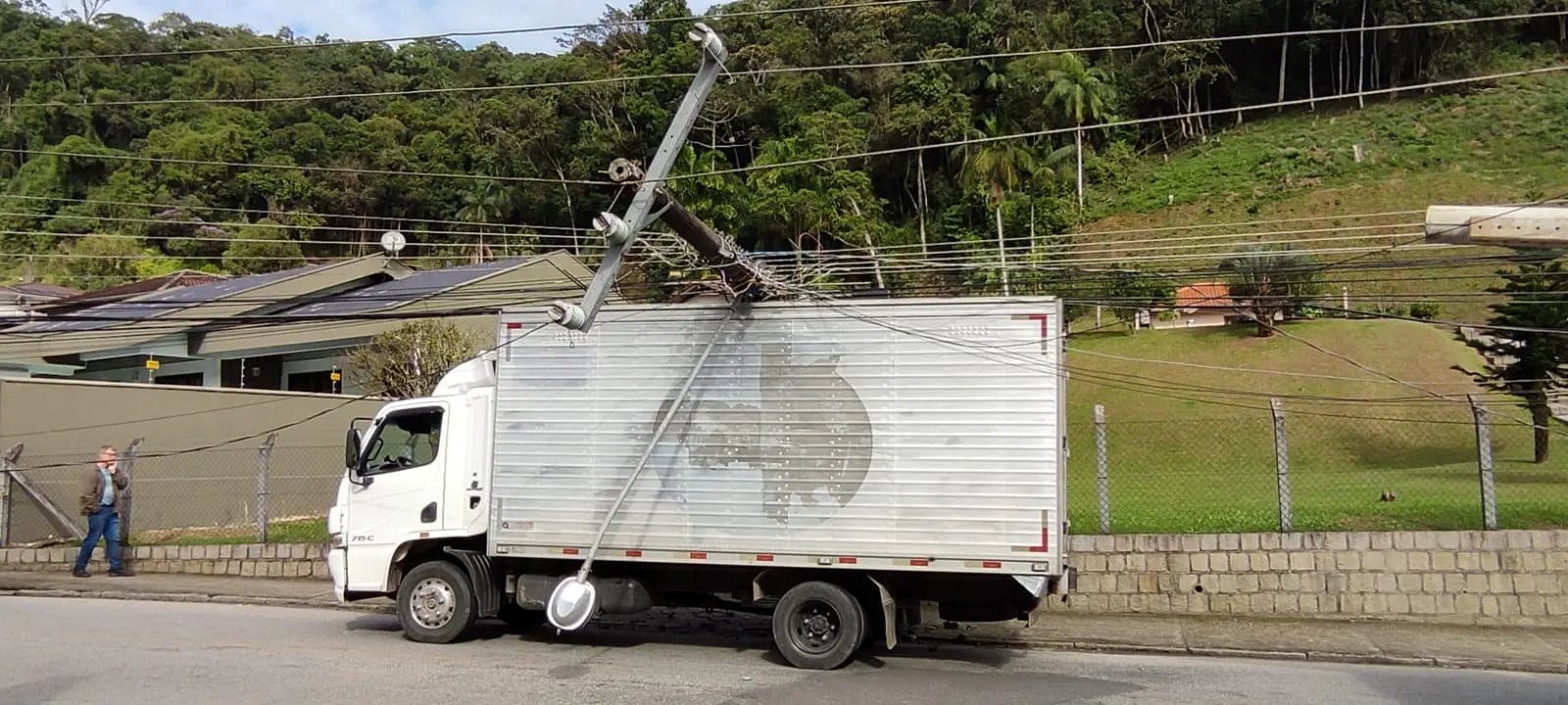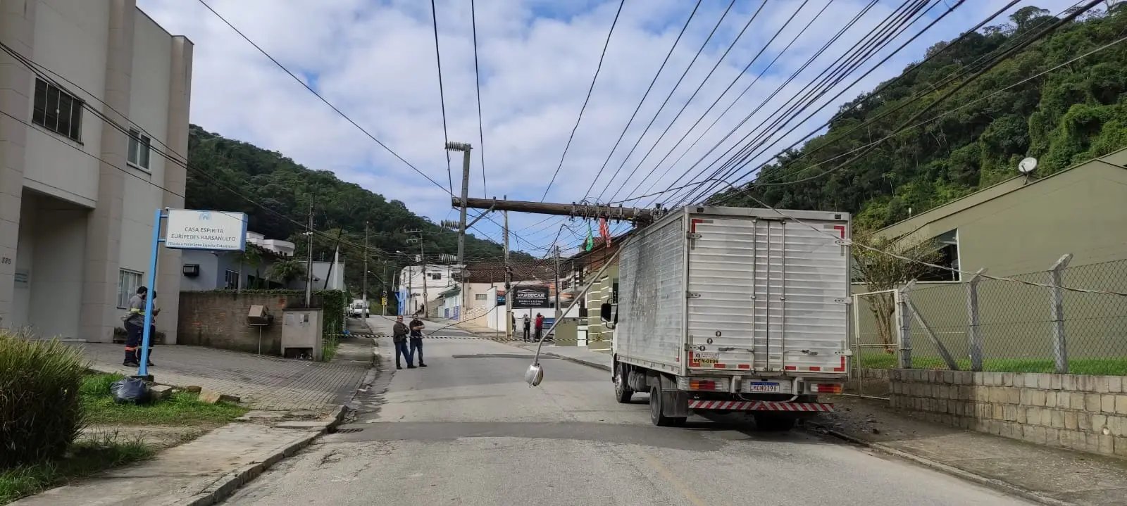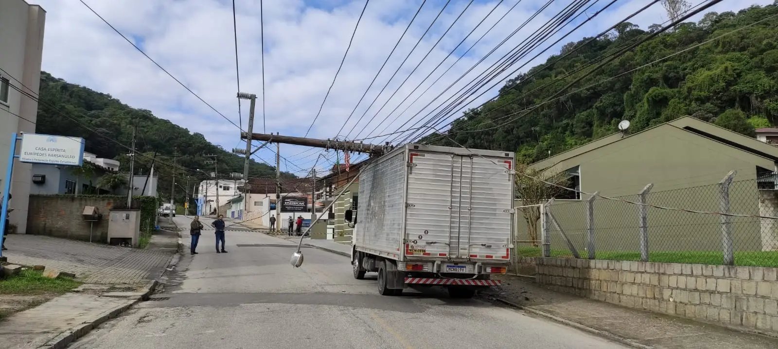 Segundo o que apurou a reportagem no local, o caminhão passou e acabou enroscando o baú na na fiação, puxando-a para cima de si.