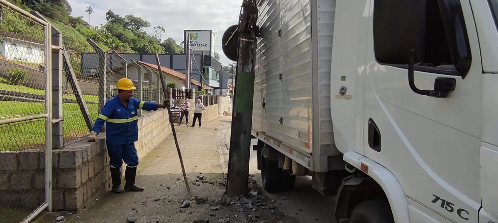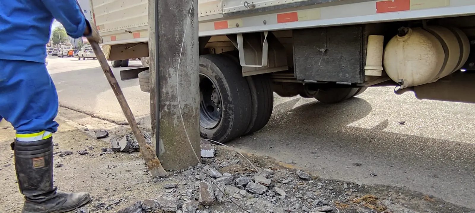 A reportagem da Rádio Cidade FM esteve no local e verificou que o poste ainda estava sobre o caminhão. Ele ficou suspenso pela fiação e na própria estrutura do veículo. O motorista não se feriu.