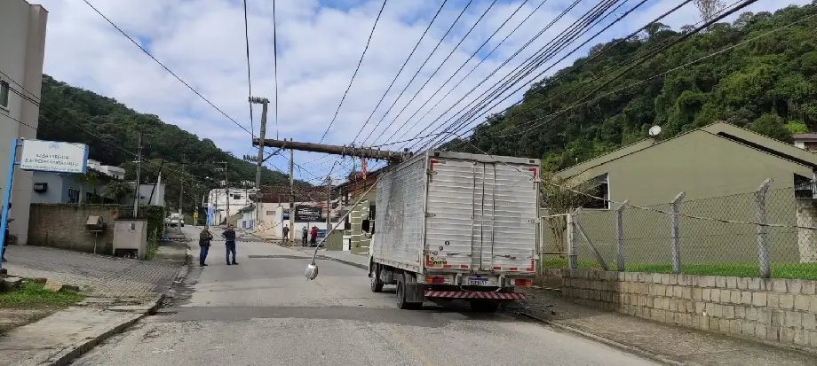 O motorista de um caminhão tomou grande susto na manhã desta segunda-feira (14) em Brusque. Um poste caiu sobre o veículo quando ele trafegava pela Rua Gustavo Halfpap, no Centro II.