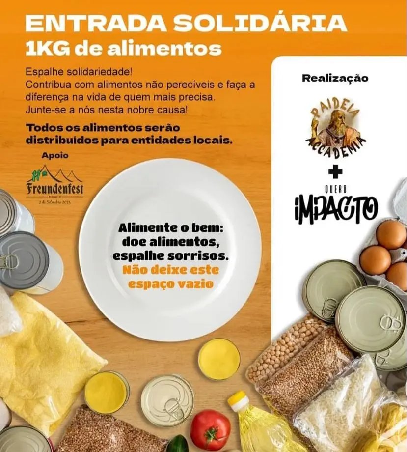 A Freundenfest uniu forças com o Projeto Social Quero Impacto e o Grupo de Estudos Paideia Accademia para promover uma iniciativa solidária. Os visitantes têm a oportunidade de contribuir com 1kg de alimento não perecível no momento da entrada. Essa ação visa beneficiar entidades locais e fortalecer futuras atividades do Projeto.