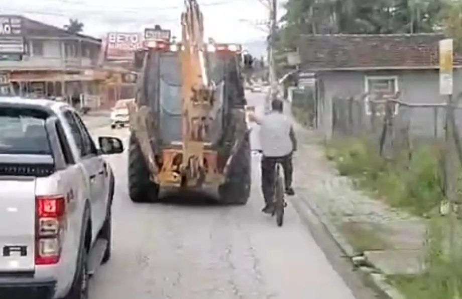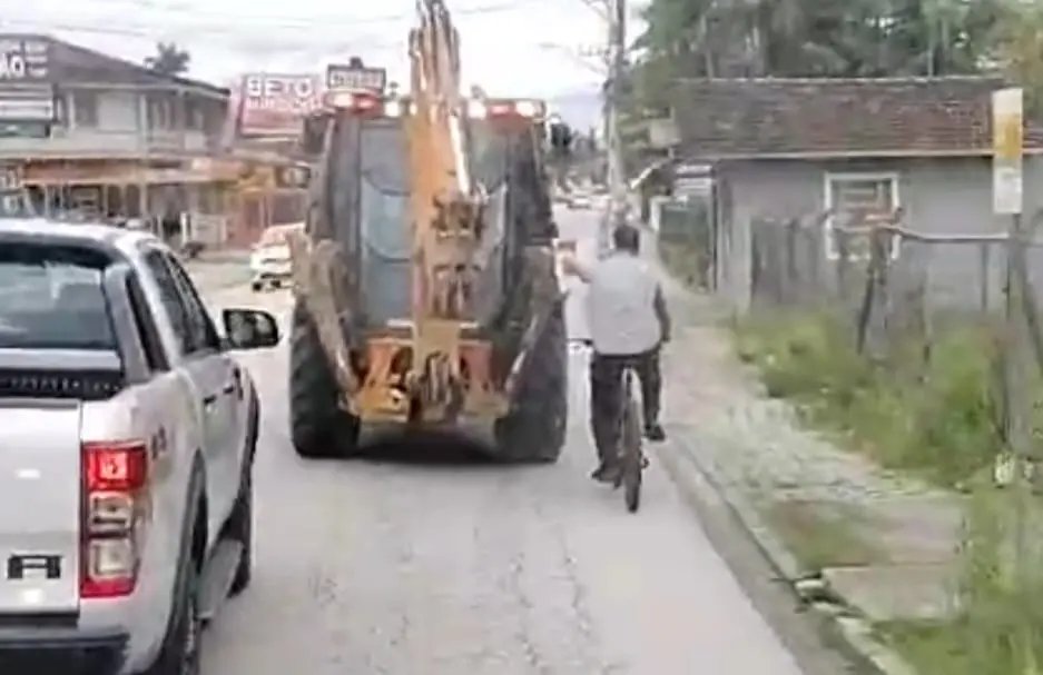 Cena inusitada foi registrada nas ruas de Brusque na manhã desta terça-feira (5). Um ciclista e pegou carona segurando em uma máquina retroescavadeira e seguiu por uma longa distância.