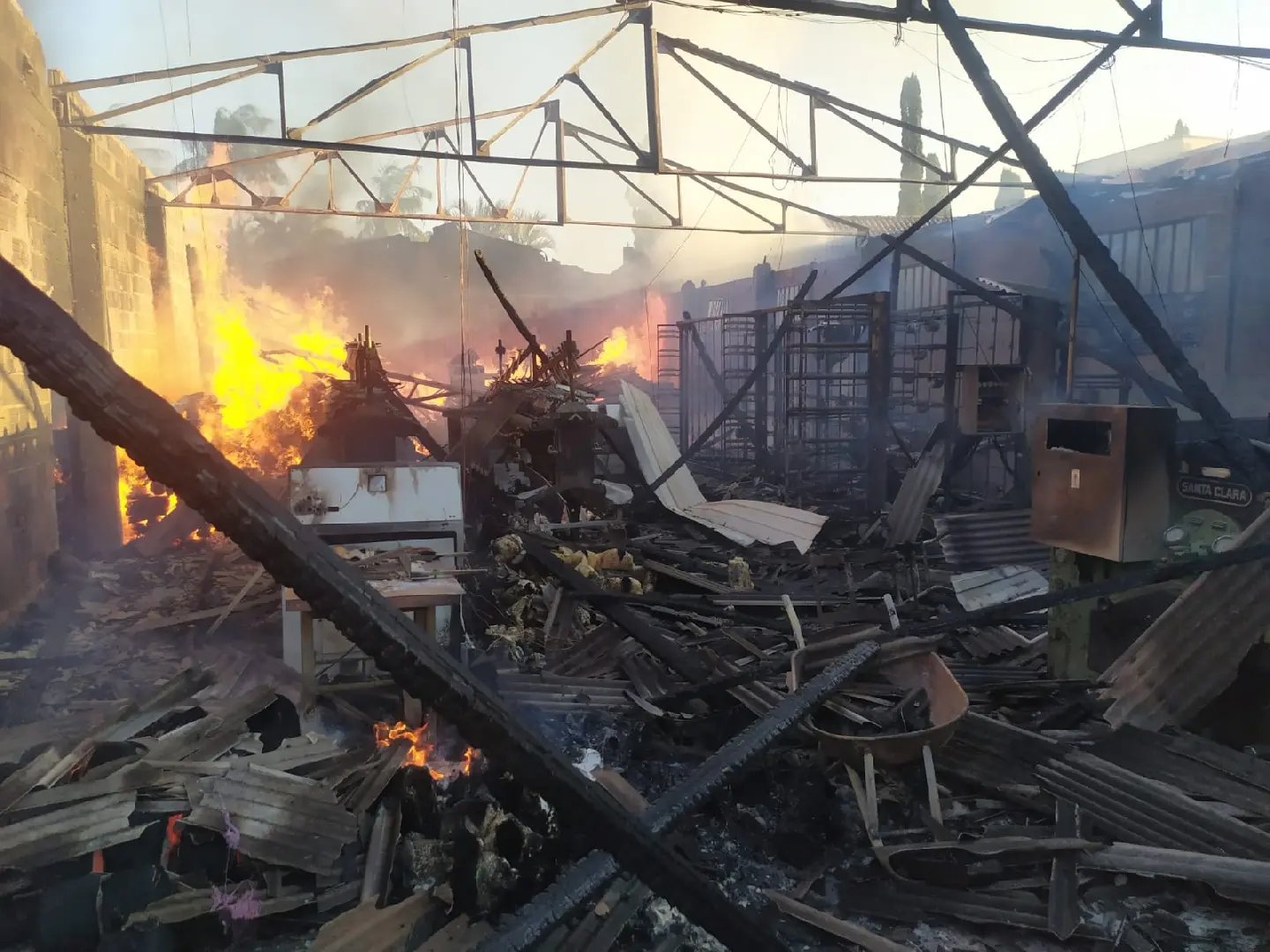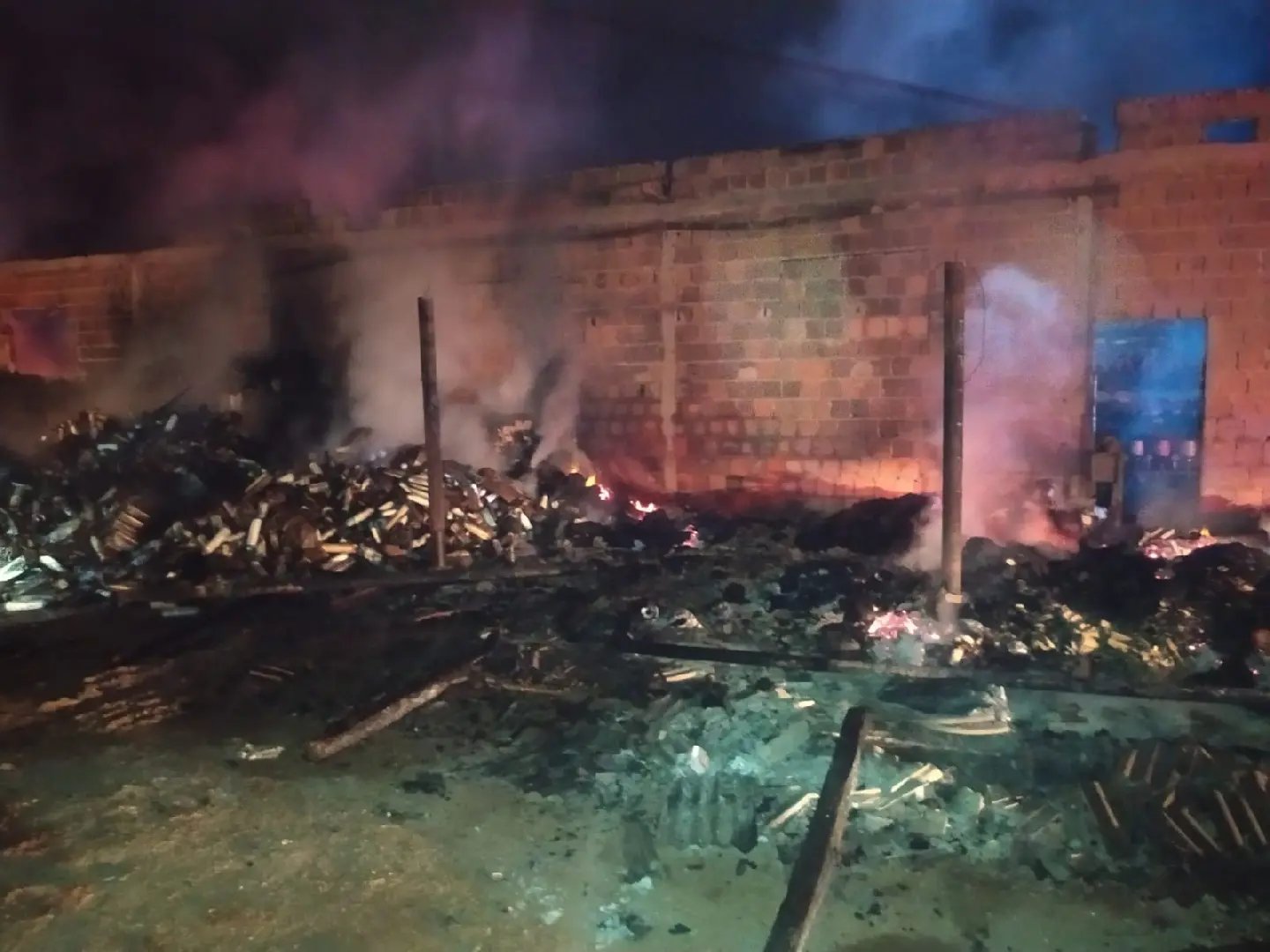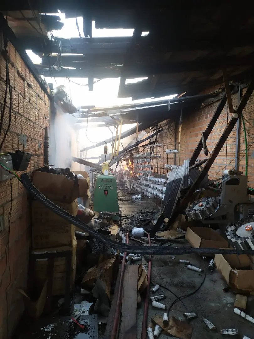 De acordo com o Corpo de Bombeiros, as chamas tomaram conta de uma área de, aproximadamente, 336 metros quadrados. Mais de dez profissionais atuaram para combater o incêndio, que destruiu o galpão, oito toneladas de fio, madeira empilhada, materiais de trabalho e outros objetos.