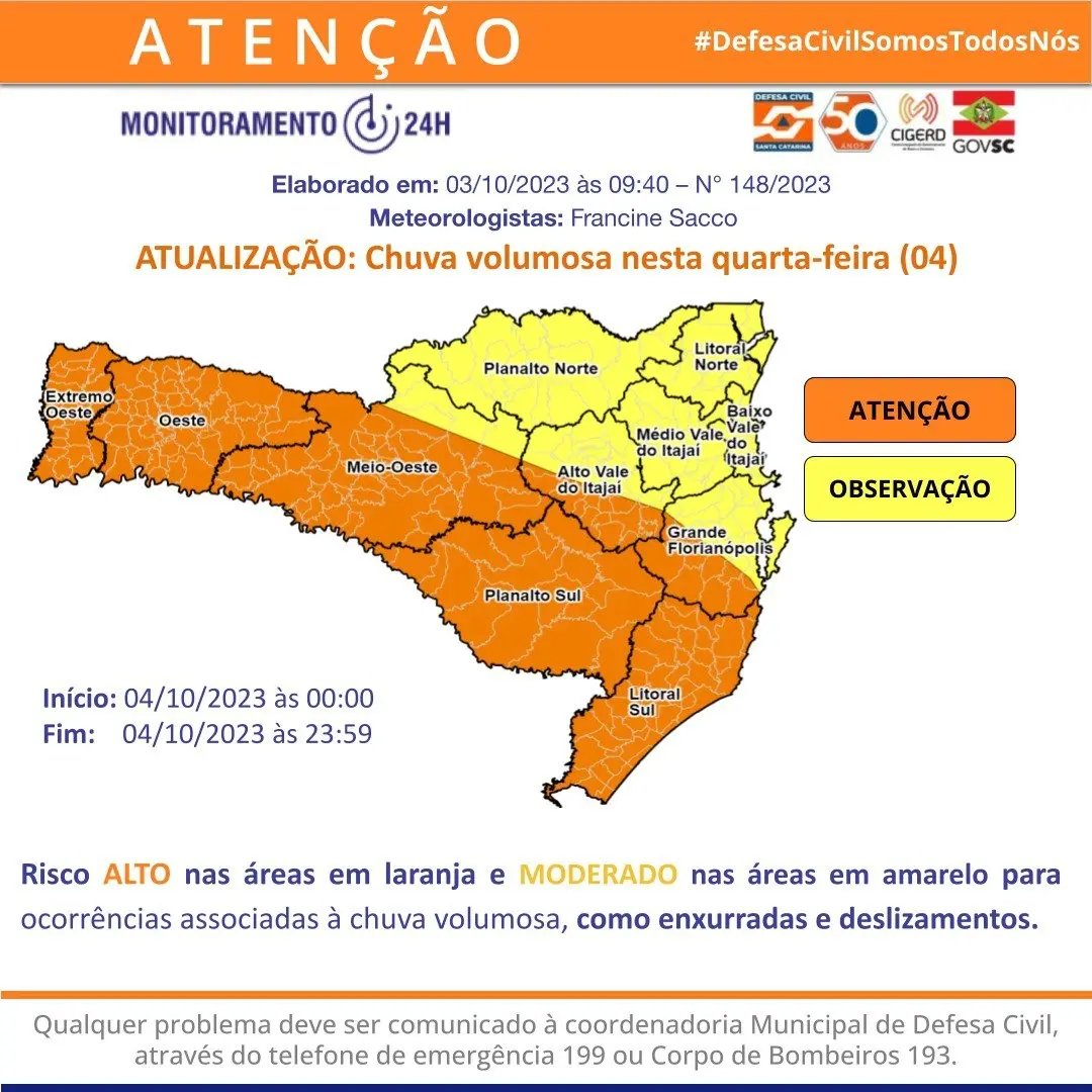 Esta mesma frente fria mantém o tempo instável com chuva persistente ao longo da quarta-feira (4) em todas as regiões do estado. São esperados volumes médios entre 60 e 90mm . Em Brusque, o risco é moderado para enxurradas, alagamentos e deslizamentos.