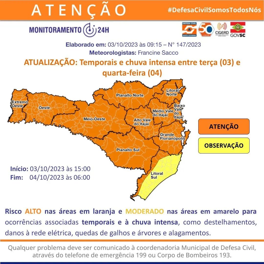 A partir da tarde desta terça (3) e na madrugada de quarta (4) o avanço de uma frente fria pelo Sul do Brasil combinada a um sistema de baixa pressão no Paraguai, favorece a ocorrência de temporais em todo o estado de Santa Catarina, acompanhados de rajadas de vento, chuva intensa e com chance de granizo.