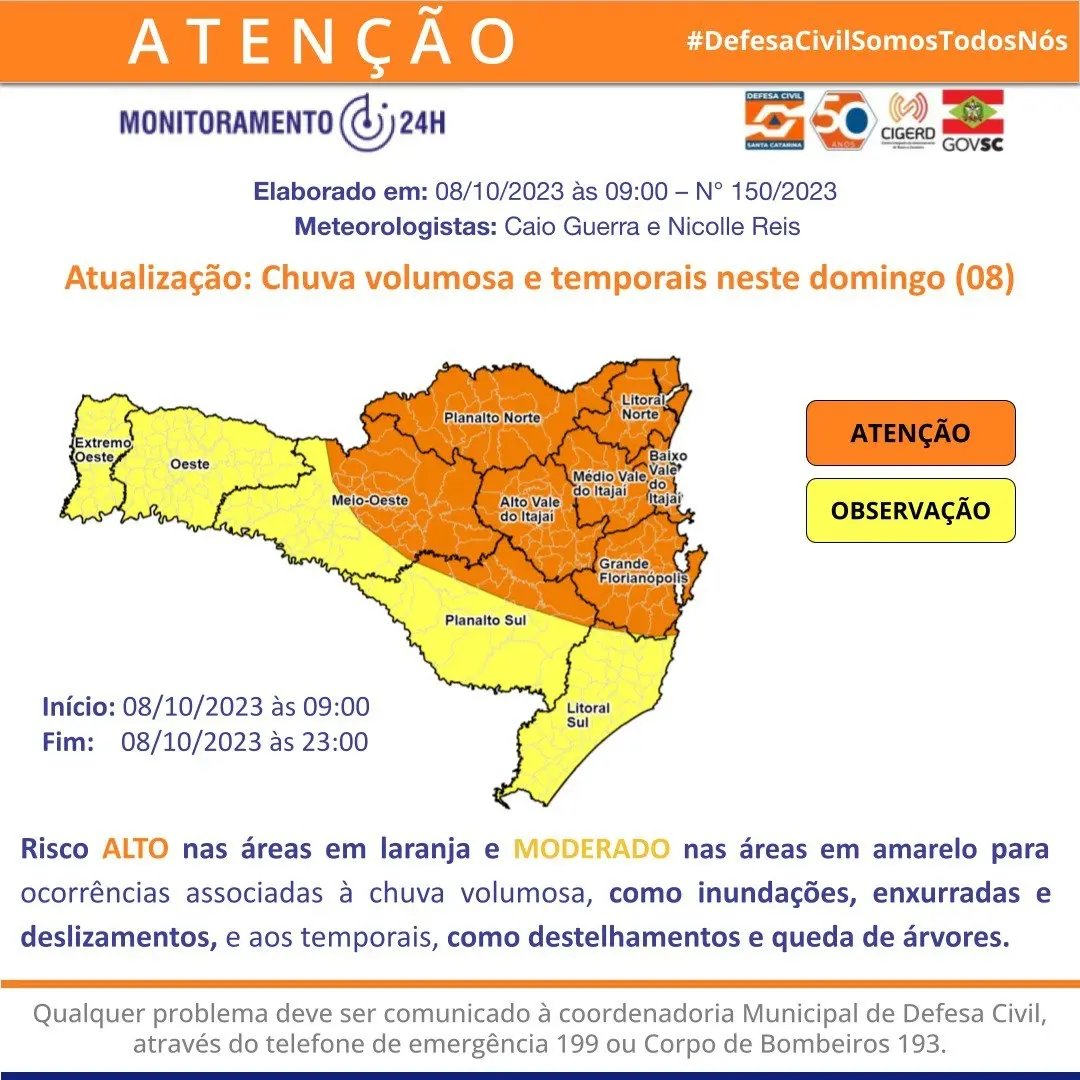 SC tem 120 cidades com ocorrências e 54 municípios em situação de emergência
