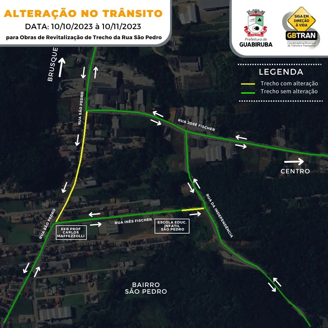 O GBTRAN, órgão de trânsito de Guabiruba, informa o fechamento parcial da Rua São Pedro, bairro de mesmo nome, nesta terça-feira, 10. O motivo da interdição é para obras de revitalização do trecho entre a Rua José Fischer e a Escola Professor Carlos Maffezzolli.