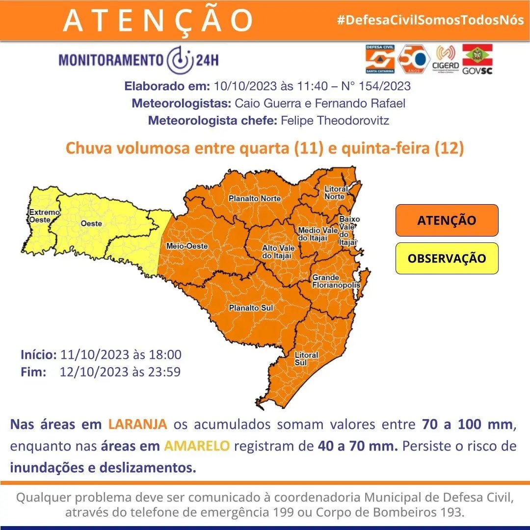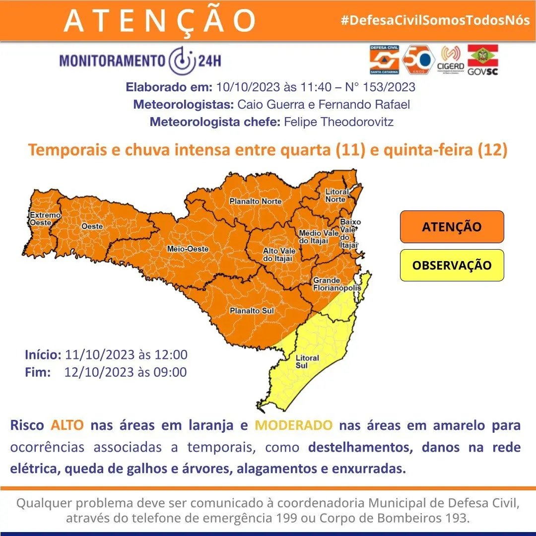 Entre a tarde quarta (11) e a manhã de quinta-feira (12), a previsão indica o retorno dos temporais em todo o estado de Santa Catarina, com destaque para as áreas do Grande Oeste, Planaltos e em todo o Vale do Itajaí. O risco é alto para ocorrências associadas a temporais e a chuva intensa, como alagamentos e enxurradas, assim como destelhamentos, danos na rede elétrica, queda de galhos e árvores.