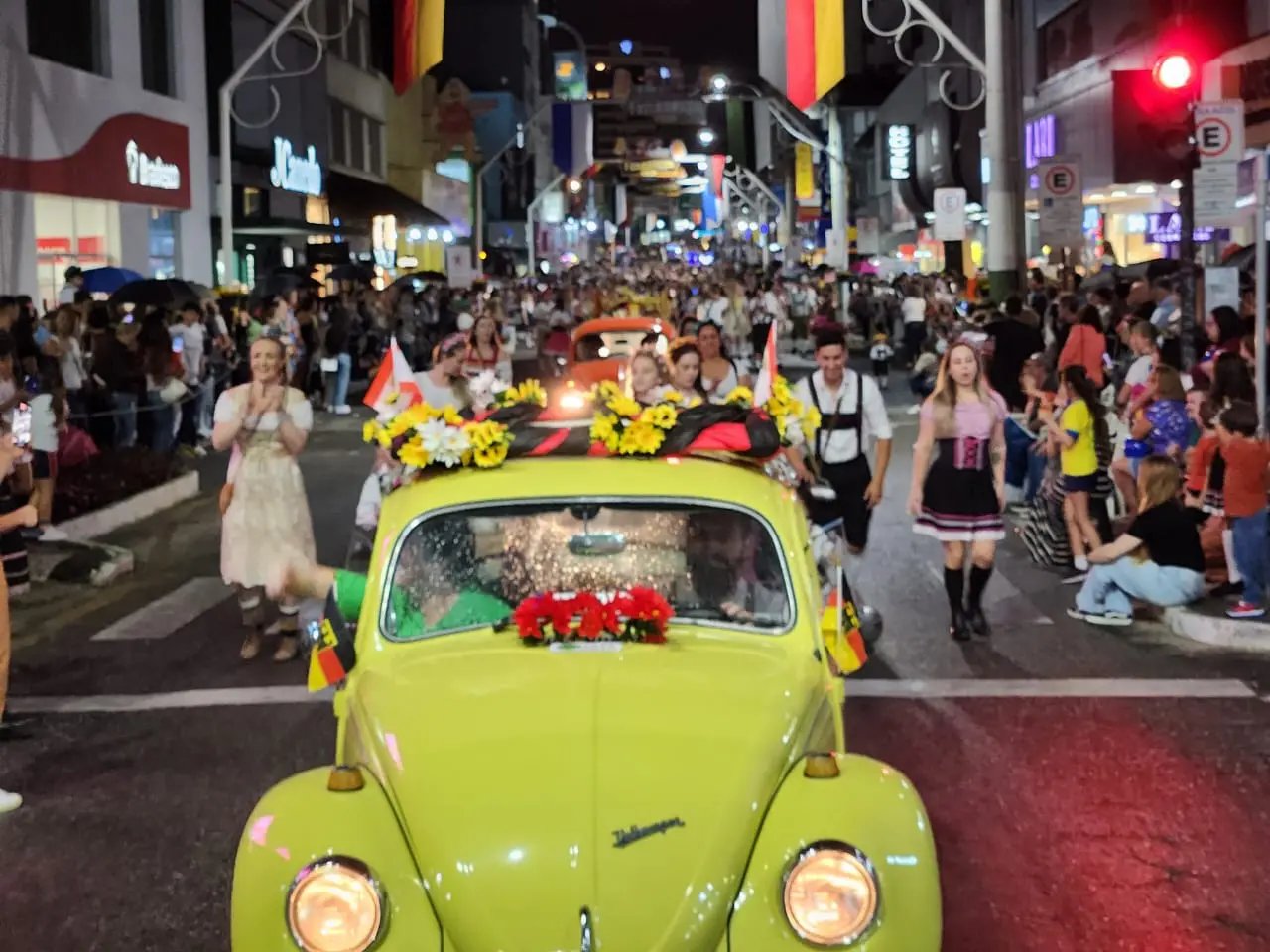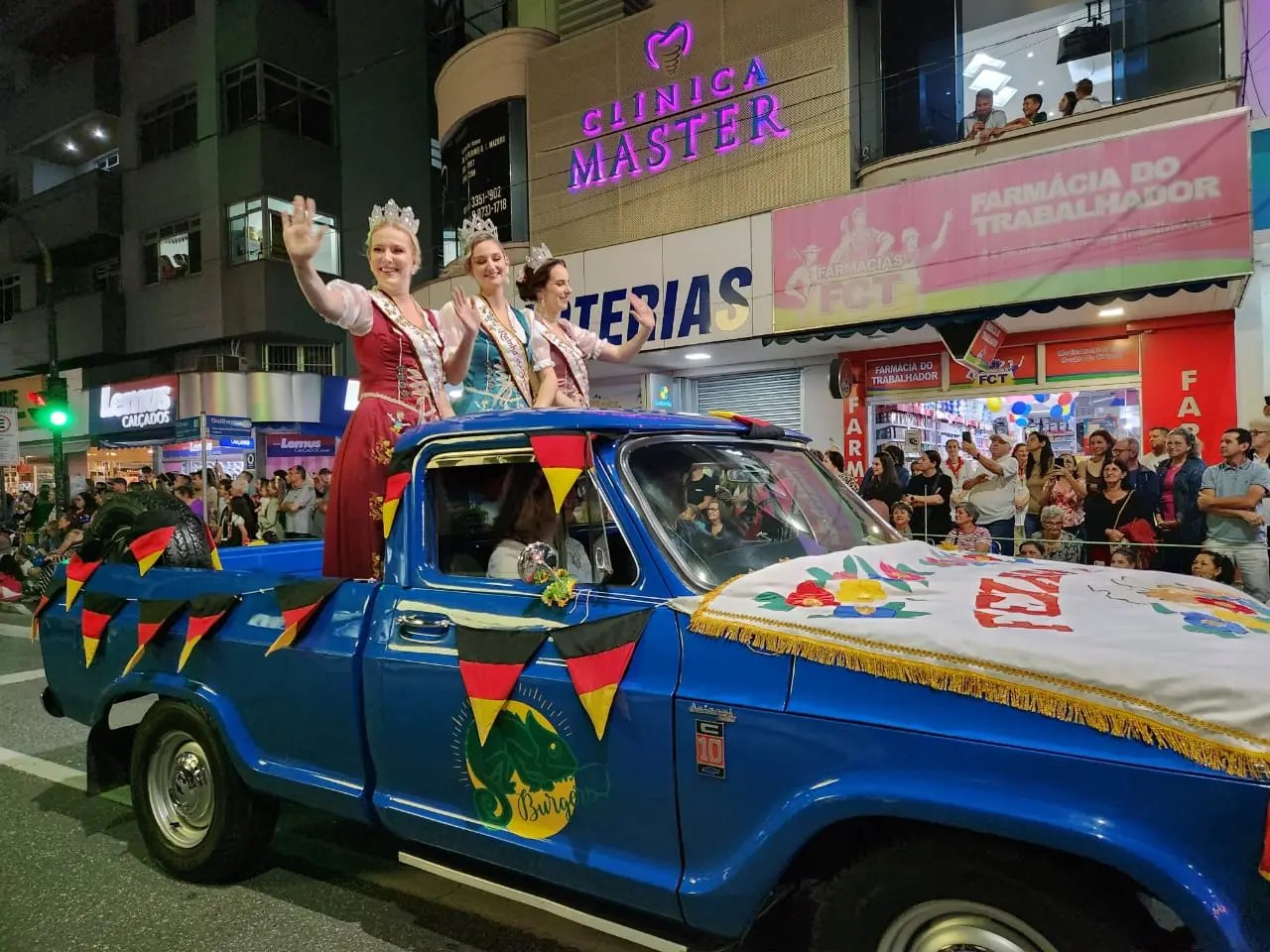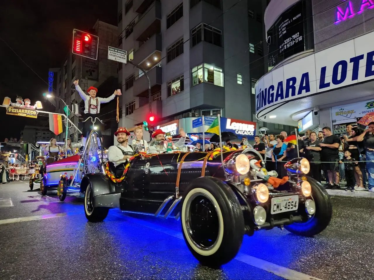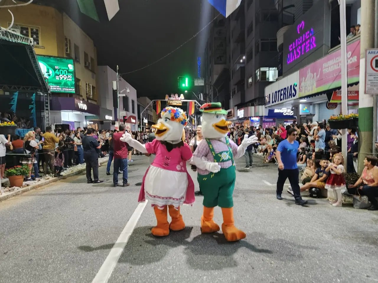 "Exatamente, ficamos com aquela saudade, aquela vontade de realizar o desfile que deveria ter acontecido na semana passada, mas acabou sendo adiado devido à chuva. Hoje, o tempo deu uma melhorada durante o dia; à noite, começou a relampejar, mas a chuva não conseguiu deter a alegria dos Brusquenses na avenida. Mais de 80 grupos desfilaram, curtindo e se divertiram, juntamente com a população em grande número, prestigiando o tradicional desfile da Fenarreco. Estou muito feliz com o público e a organização. Agora, saindo de lá, todos os caminhos levam ao pavilhão Fenarreco."