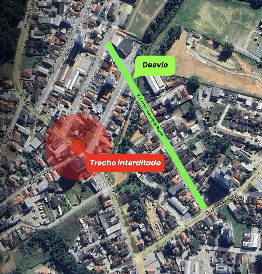 O principal desvio deverá ser realizado pela rua Carlos Henrique Bruns, rua da Igreja Capela Cristo Rei. Aos condutores vindos das ruas São Pedro e São Leopoldo poderão utilizar as ruas Paulo Bauer, Pedro Gracher (vias localizadas ao entorno do Colégio Francisco de Araújo Brusque) e consequentemente para rua Carlos Henrique Bruns para acessar a rua Anita Garibaldi e Felipe Schmidt para deslocamento ao Centro da cidade.