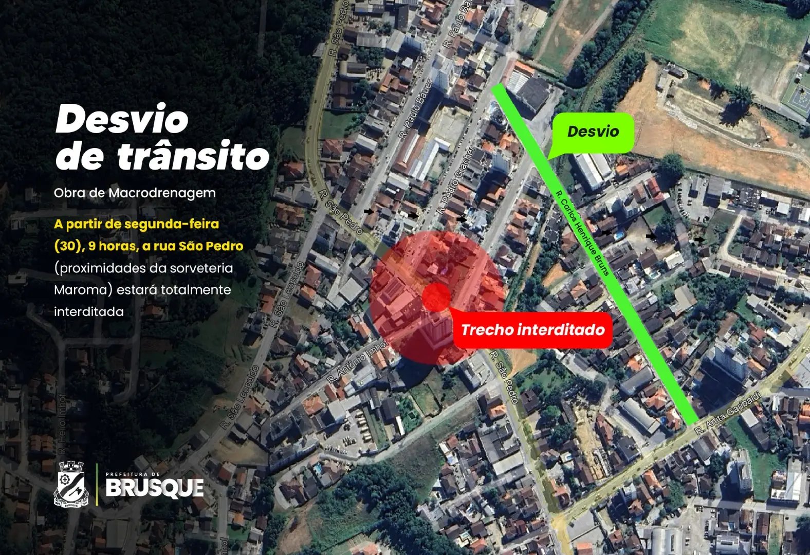 A Diretoria de Trânsito de Brusque informa que, na próxima segunda-feira (30), a rua São Pedro, nas proximidades da sorveteria Maroma) estará totalmente fechada, a partir das 9 horas. A medida é necessária devido as obras de macrodrenagem que estão sendo executadas na rua Prefeito Rodolfo Gerlack.