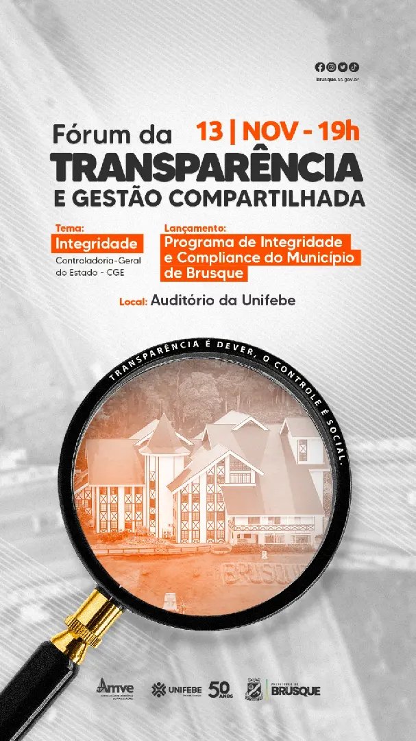 Na próxima segunda-feira (13) ocorre a quarta edição do Fórum da Transparência e Gestão Compartilhada, que este ano tem como tema Integridade e Compliance, ministrado pela Controladoria-Geral do Estado. O evento inicia 19 horas, no auditório do bloco F da Unifebe, e é aberto a toda a comunidade. Na oportunidade será lançado o Programa de Integridade e Compliance do Município de Brusque.
