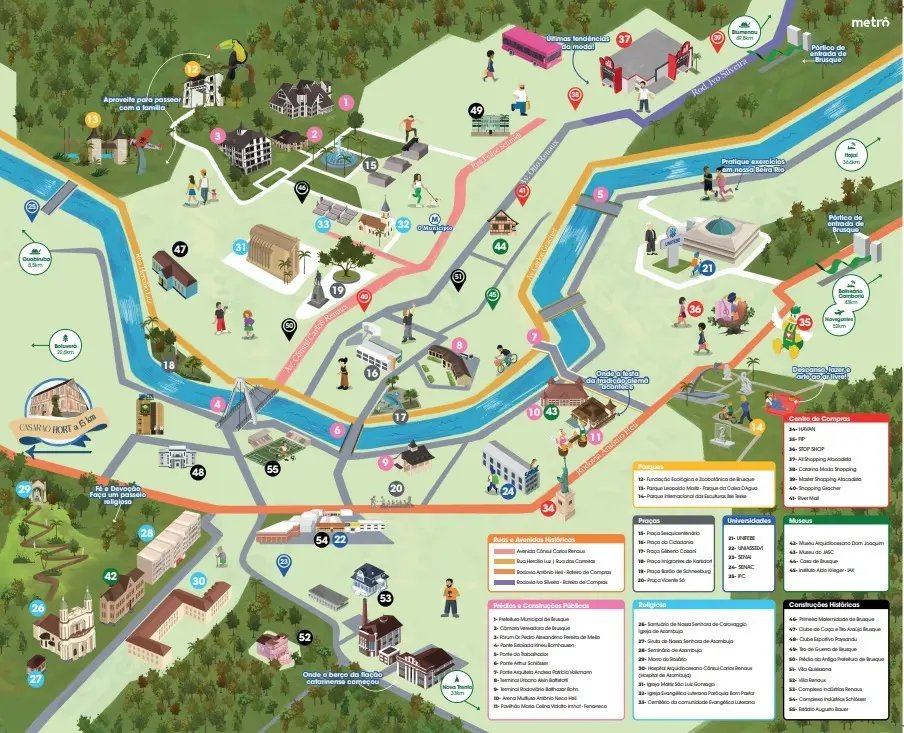 O mapa abrange os principais pontos turísticos da cidade, tais como o Parque Zoobotânico, Praça das Esculturas, Parque Leopoldo Moritz, Pavilhão da Fenarreco, as principais igrejas, praças e eventos como o Natal, Fenarreco, Fenajeep e Festival da Cuca.