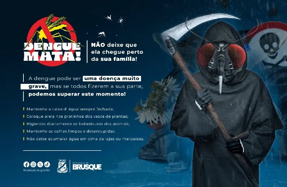A campanha abrange também veiculação em mídias exteriores, como telões de led e carros de som, além de spots em rádios e peças publicitárias em portais online e em jornais de circulação regional. “Visando trazer mais impacto para a situação, tentamos comparar o Aedes aegypti à morte. Os materiais gráficos ilustram o mosquito fantasiado de morte, remetendo à real preocupação da doença. Além disso, é claro, os materiais que se utilizam do artifício do humor também estão inclusos nas redes sociais da Prefeitura de Brusque, buscando dar maior ressonância às mensagens”.