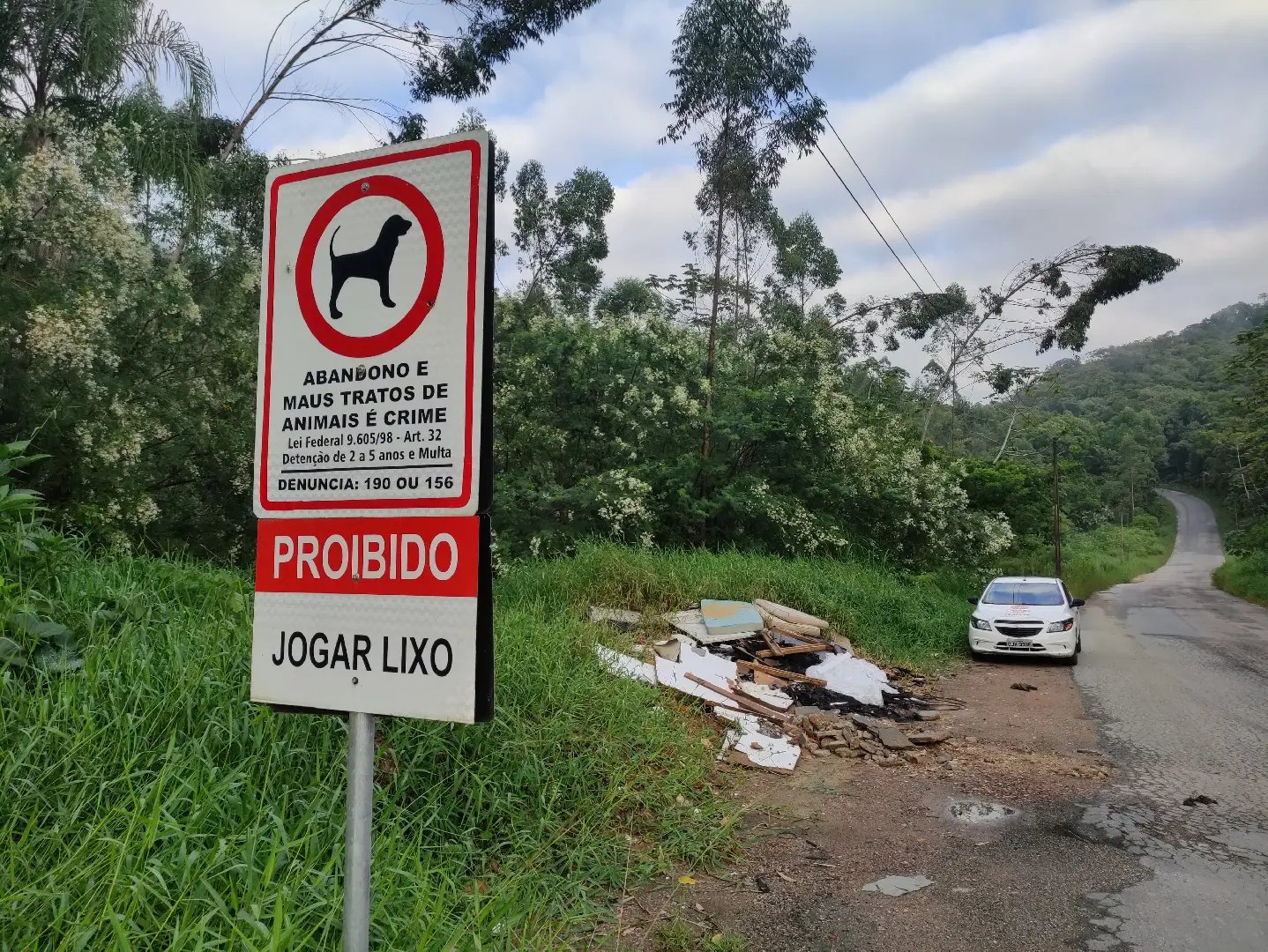 Ao lado de um ponto de entulho há uma placa escrito ‘’proibido jogar lixo’’, o que é uma grande contradição para o perímetro.